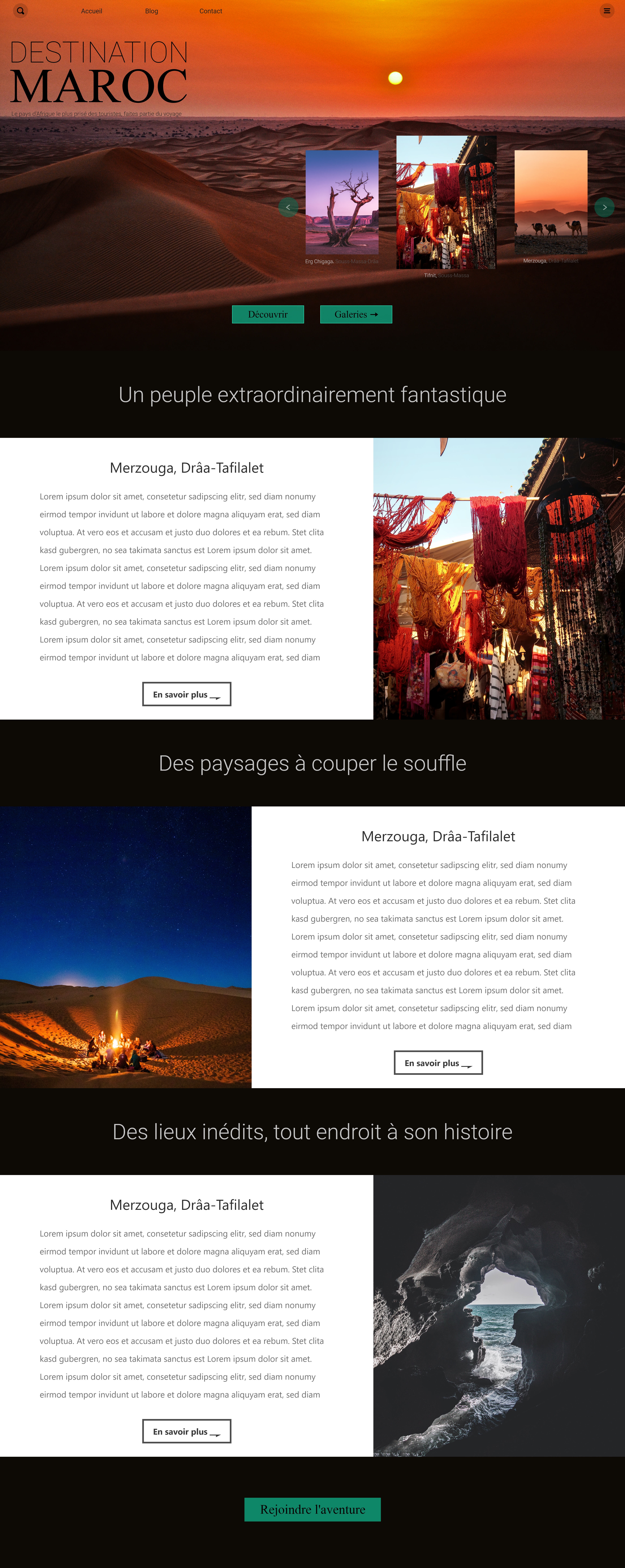 Ce projet de site est une maquette d'agence de voyages à destination du Maroc. Il fut imaginé de manière à accepter un grand nombre de jeu de couleurs d'arrière-plan.