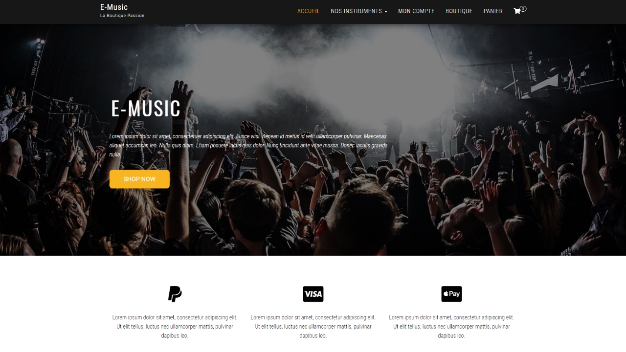 E-music est un site web utilisant wordpress. Ce site a pour vocation de vendre des instruments de musique: guitares, batteries, violons, ect. Le tunnel d'achat est conçu mais aucun livraison ne sera effectué. Aucun paiement n'est possible: ce site est fictif.