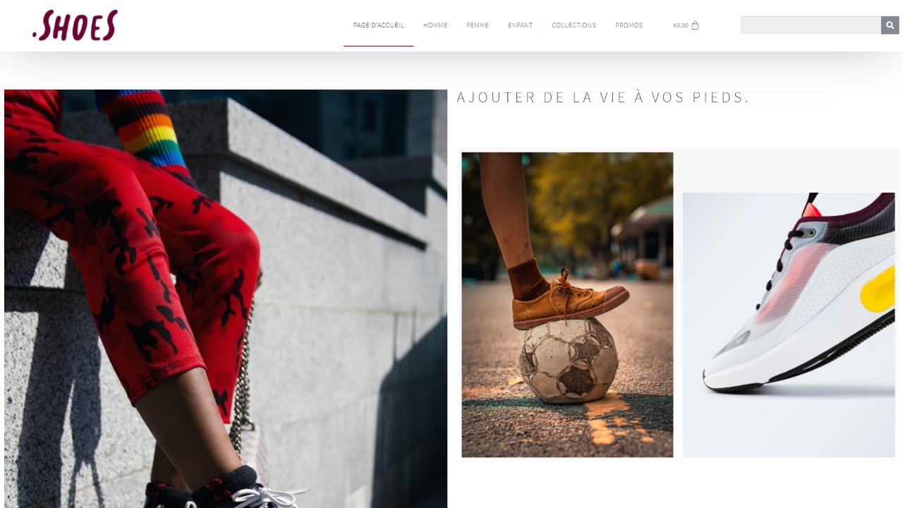 Shoes est un projet de site web e-commerce fictif. Ici il est question, comme son nom l'indique, de vendre des chaussures de marques. Conçu sur Wordpress en utlisant le plugin Woocommerce, il fut réalisé en formation.