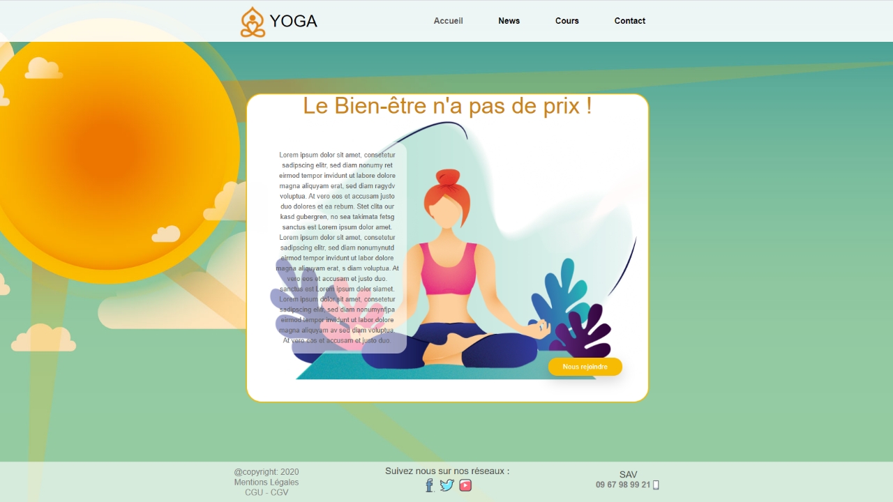 Un peu de yoga pour se détendre ... Voici un site dédié a la pratique du yoga. Il est possible de souscrire à un abonnement ou d'acheter un cours vidéo unique. Comme les précedents, ce site est fictif est aucun engagement ne sera tenu.
