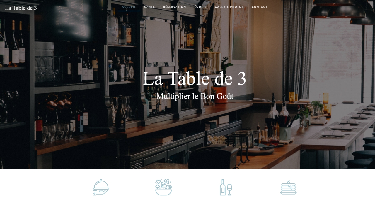 Le site internet La Table de 3 est un projet de formation fictif ayant pour but de mettre en avant le restaurant du même nom. La carte y est disponible, ainsi que la possibilité de prendre une réservation.